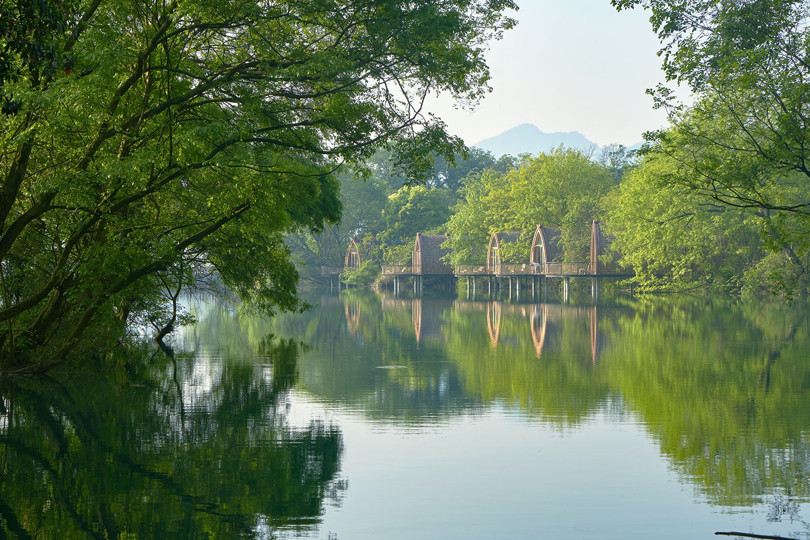本項(xiàng)目是杭州富春開(kāi)元芳草地鄉(xiāng)村酒店的一組特色船屋客房。酒店坐落在建德富春江畔,梅城古鎮(zhèn)東約五公里處,而船屋則“漂浮”在酒店30畝湖面西岸。晨景
